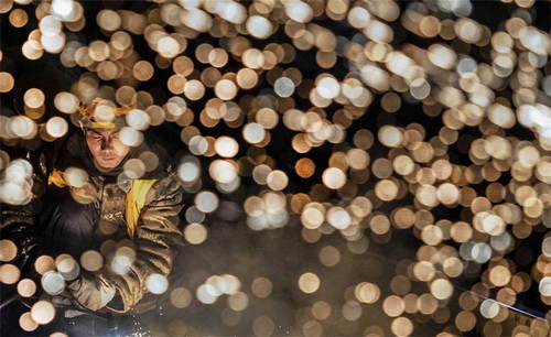 2019年1月15日凌晨,中鐵十一局施工人員在陜西省西安火車站改擴建工程現場切割鋼軌。新華社記者陶明攝
