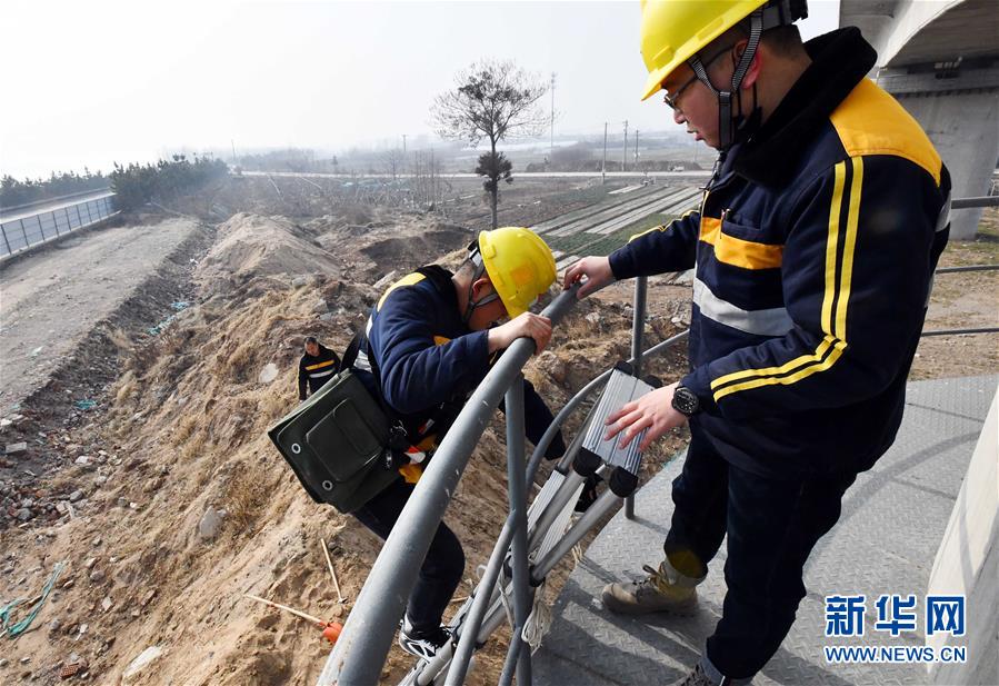 1月3日,中國鐵路濟南局臨沂工務(wù)段工程技術(shù)員準備對沂河特大橋橋墩進行檢查。新華社記者 朱崢攝