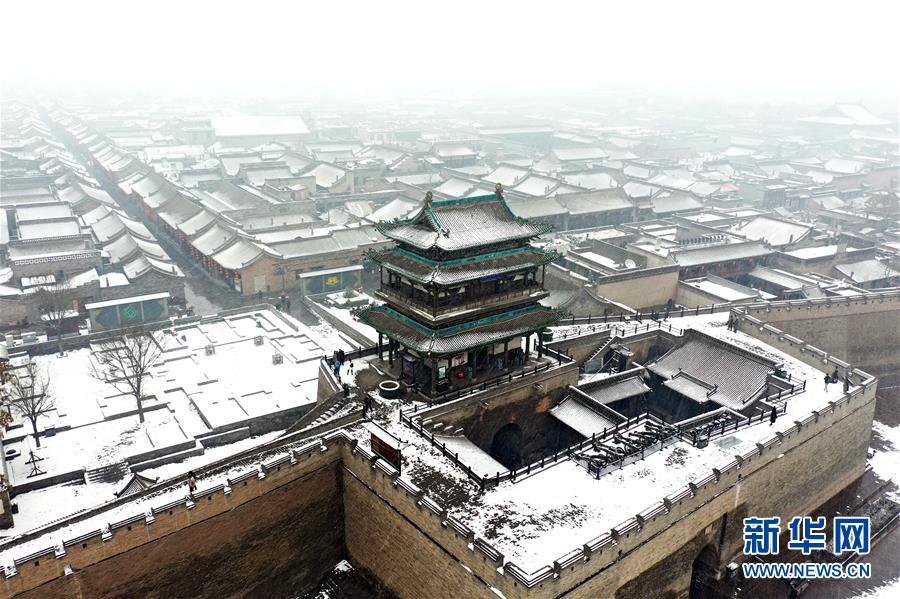 1月5日拍攝的平遙古城迎薰門城樓(無人機(jī)照片)。新華社記者詹彥攝