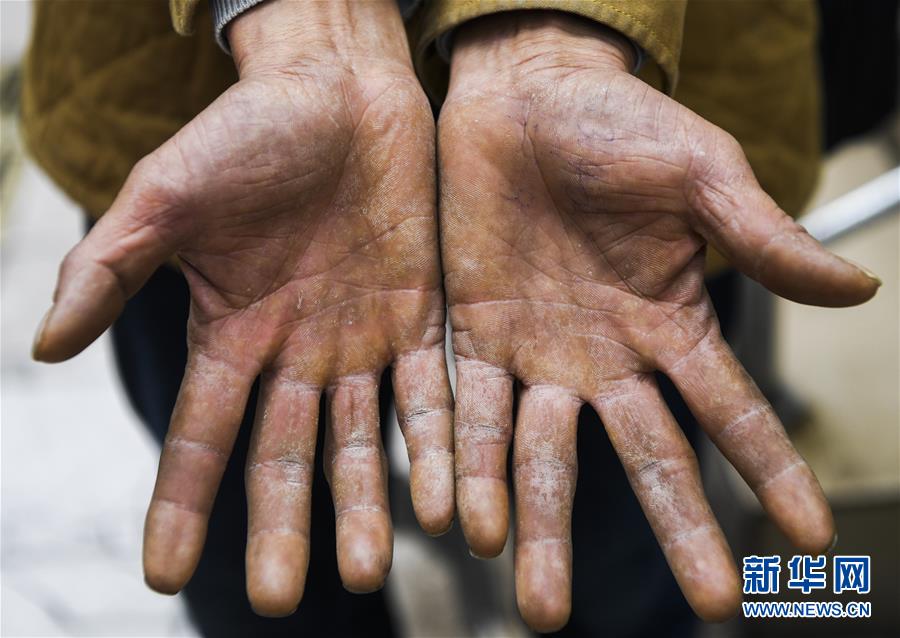 冉光輝展示自己的雙手(1月5日攝)。由于長期搬運重物,他的手磨出了不少老繭,指關(guān)節(jié)也有點變形。新華社記者王全超攝