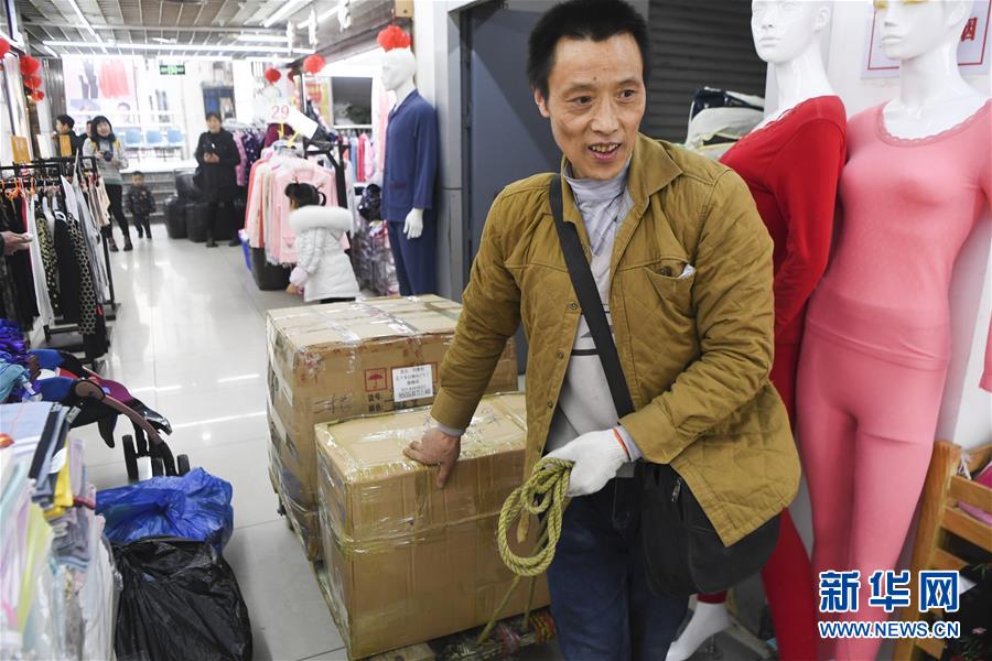 冉光輝在重慶朝天門大正商場內(nèi)整理即將搬運的貨物(1月5日攝)。新華社記者王全超攝