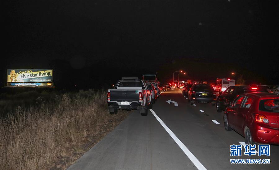 11月10日夜間,在澳大利亞新南威爾士州塔里附近道路上,由于山火封路,當?shù)鼐用耨{車排隊等待前往避難所。新華社記者白雪飛攝