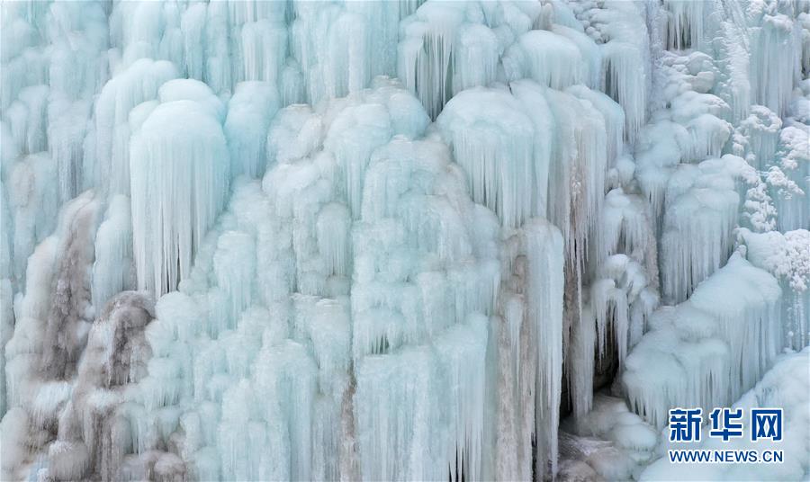 這是1月7日拍攝的賀蘭山巖畫景區(qū)內(nèi)的冰瀑景觀(無人機照片)。近日,寧夏賀蘭山巖畫景區(qū)內(nèi),自然山泉凍結(jié)冰瀑和人造冰瀑景觀相結(jié)合,形成多處冰瀑景觀,山間形態(tài)各異的冰掛、冰柱鬼斧神工,蔚為壯觀,吸引眾多游客前來觀賞。 新華社記者 王鵬 攝