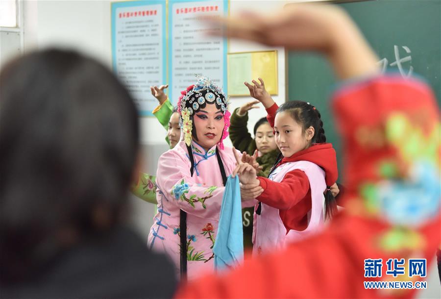 1月7日,定州市興定秧歌劇團(tuán)演員在明月店鎮(zhèn)吳咬村小學(xué)指導(dǎo)學(xué)生學(xué)習(xí)戲曲表演技藝。