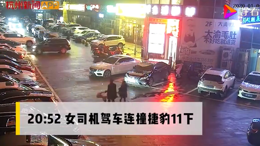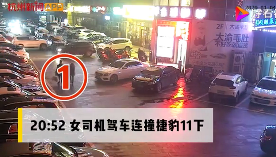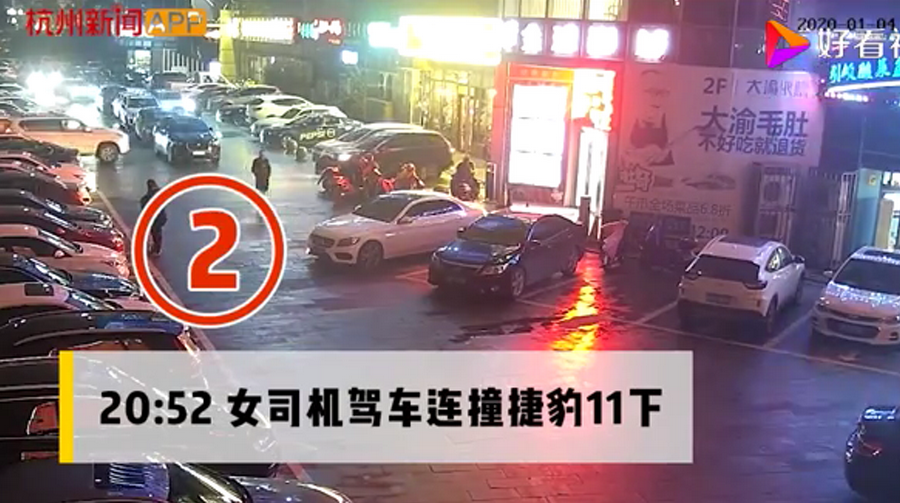 通過(guò)監(jiān)控發(fā)現(xiàn),捷豹車當(dāng)時(shí)并沒有停在停車位上,而是橫著停在停車位前的通道上,正好擋住了停在停車位里面的車輛。晚上8點(diǎn)40左右,一輛白色豐田普拉多越野車被捷豹擋住無(wú)法出去,10多分鐘后,司機(jī)通過(guò)倒車再加速十幾次撞擊捷豹,最終把車輛撞開后駛離現(xiàn)場(chǎng)。