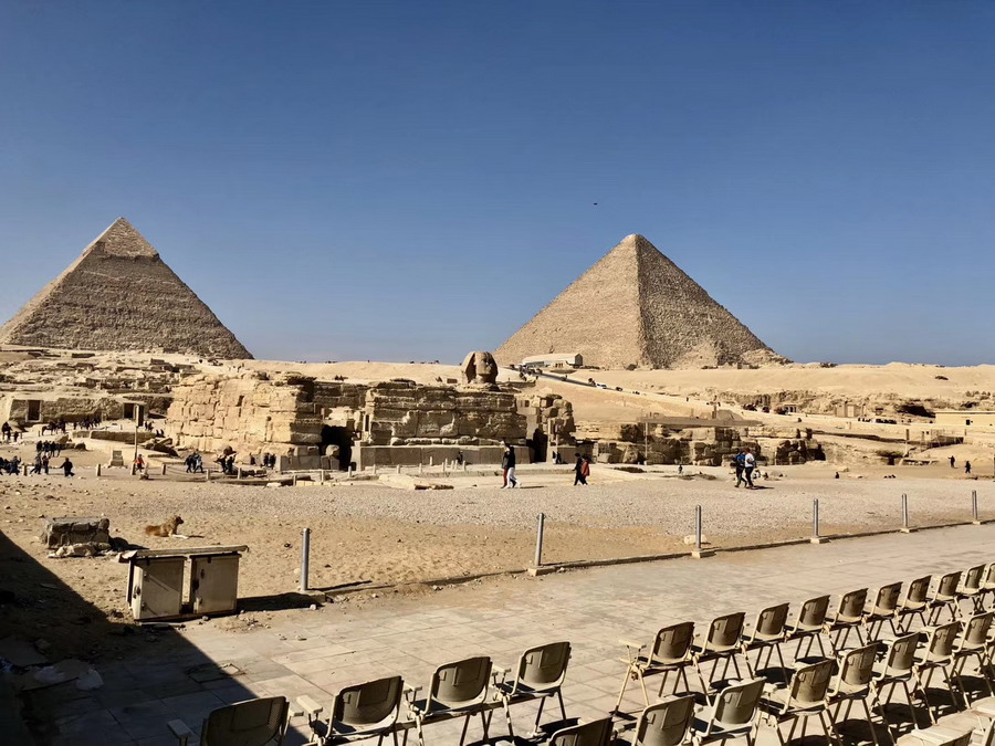 此像高20米,長57米,算上兩個前爪,全長72米。它頭戴“奈姆斯”皇冠,兩耳側有扇狀的“那姆斯”頭巾下垂,前額上刻著圣蛇浮雕,下頜有帝王的標志,下垂的長須,脖子上圍著項圈,鷹的羽毛圖案打扮著獅身。孫衛(wèi)南攝