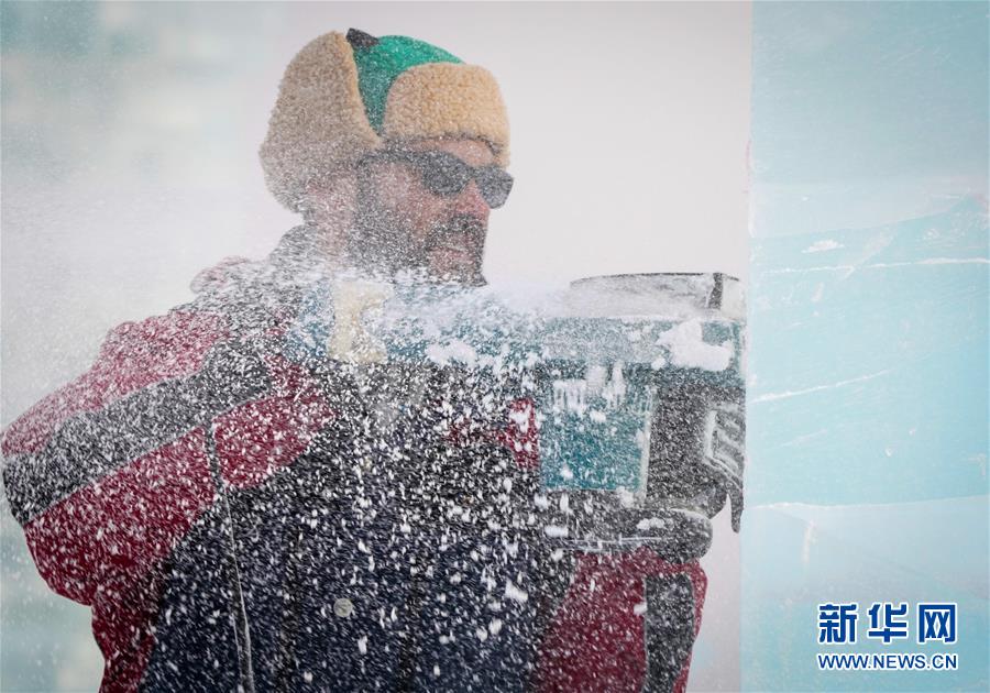 冰雕師在哈爾濱冰雪大世界內(nèi)雕刻冰雕作品(1月8日攝)。新華社記者王松攝