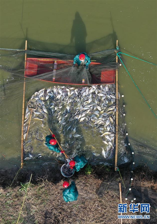 12月28日,漁民們在菱湖鎮(zhèn)盛江家庭農(nóng)場拉網(wǎng)捕魚(無人機拍攝)。新華社記者黃宗治攝