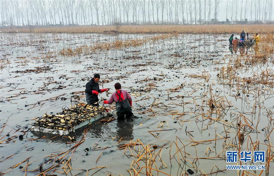 1月10日,村民在磁縣禾下土白蓮藕立體種養(yǎng)基地采收蓮藕(無人機(jī)照片)。新華社記者 王曉 攝