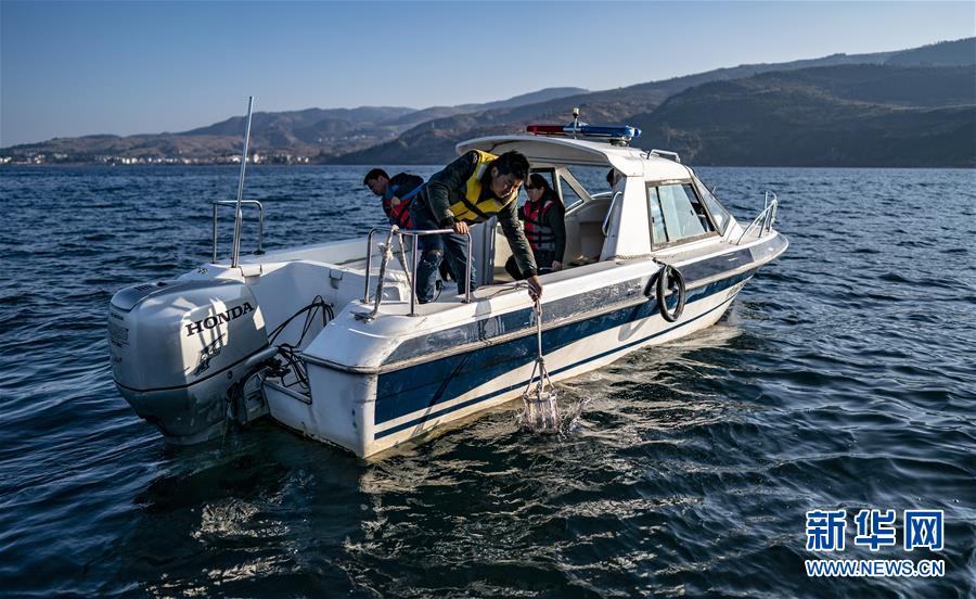 1月10日,云南省生態(tài)環(huán)境科學(xué)研究院的工作人員在撫仙湖取樣,進(jìn)行月度水質(zhì)監(jiān)測(cè)。 新華社記者 江文耀 攝
