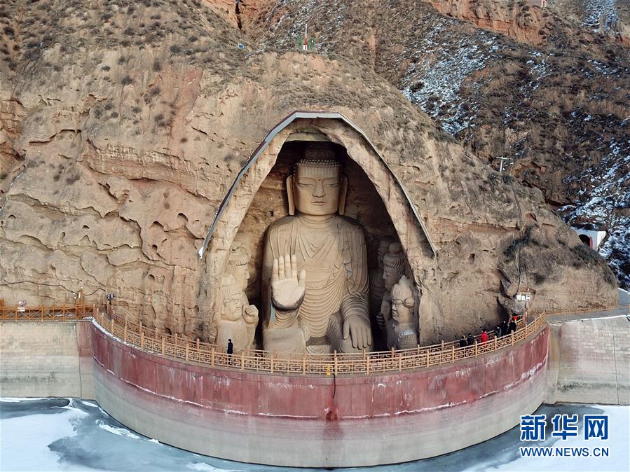 1月11日,游客在參觀天梯山石窟13號(hào)窟(無人機(jī)照片)。新華社記者馬寧攝