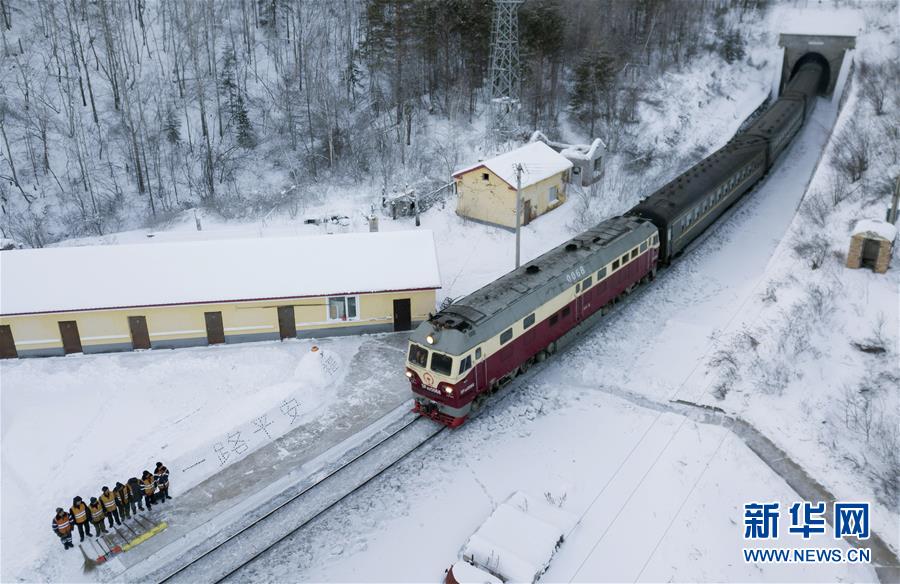 1月7日,西羅奇維修工隊(duì)工作人員在雪地上寫(xiě)下“一路平安”為經(jīng)過(guò)的列車旅客送上祝福(無(wú)人機(jī)照片)。新華社記者王毓國(guó)攝