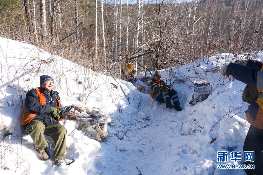 1月8日,西羅奇維修工隊工作人員在作業(yè)現(xiàn)場坐在雪地上臨時休息。新華社記者才揚攝