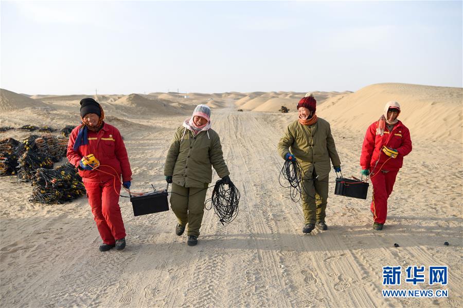 1月14日,4名測(cè)線女工抬著電瓶返回營(yíng)地。地球物理勘探是油氣開(kāi)發(fā)的第一步,相當(dāng)于給地球做CT。物探工人按照嚴(yán)格的測(cè)線部署,在相應(yīng)位置鉆井,然后實(shí)施地震,采集地震波數(shù)據(jù)??蒲腥藛T通過(guò)數(shù)據(jù)組成的“CT片”,就能夠清晰地“看”到地下的地質(zhì)結(jié)構(gòu),判斷哪里埋藏有石油或者天然氣。2019年10月,東方地球物理勘探有限責(zé)任公司塔里木物探處2113隊(duì)進(jìn)入新疆塔克拉瑪干沙漠腹地,開(kāi)始中古14-21、塔中2兩個(gè)區(qū)塊的三維地震勘探。近2000名物探工人將在1000平方公里的范圍內(nèi)一直工作到2020年4月,這也意味著他們將在塔克拉瑪干沙漠腹地連續(xù)度過(guò)第14個(gè)除夕夜。蘊(yùn)藏著豐富石油天然氣資源的新疆塔克拉瑪干沙漠有“死亡之?!敝Q,氣候干燥,年降水量在50毫米以下,冬季地表最低溫度超過(guò)零下30攝氏度,是世界油氣勘探難度最大的地區(qū)之一。為避開(kāi)風(fēng)季,物探工人每年9、10月份進(jìn)入沙漠,一直工作到來(lái)年4月,夜以繼日與黃沙、嚴(yán)寒為伴,用辛勤的汗水,為祖國(guó)找油找氣。新華社記者丁磊攝