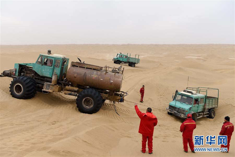 一輛測(cè)量作業(yè)車(chē)陷在沙坑中,水罐車(chē)進(jìn)行營(yíng)救(1月13日攝)。地球物理勘探是油氣開(kāi)發(fā)的第一步,相當(dāng)于給地球做CT。物探工人按照嚴(yán)格的測(cè)線部署,在相應(yīng)位置鉆井,然后實(shí)施地震,采集地震波數(shù)據(jù)??蒲腥藛T通過(guò)數(shù)據(jù)組成的“CT片”,就能夠清晰地“看”到地下的地質(zhì)結(jié)構(gòu),判斷哪里埋藏有石油或者天然氣。2019年10月,東方地球物理勘探有限責(zé)任公司塔里木物探處2113隊(duì)進(jìn)入新疆塔克拉瑪干沙漠腹地,開(kāi)始中古14-21、塔中2兩個(gè)區(qū)塊的三維地震勘探。近2000名物探工人將在1000平方公里的范圍內(nèi)一直工作到2020年4月,這也意味著他們將在塔克拉瑪干沙漠腹地連續(xù)度過(guò)第14個(gè)除夕夜。蘊(yùn)藏著豐富石油天然氣資源的新疆塔克拉瑪干沙漠有“死亡之?!敝Q,氣候干燥,年降水量在50毫米以下,冬季地表最低溫度超過(guò)零下30攝氏度,是世界油氣勘探難度最大的地區(qū)之一。為避開(kāi)風(fēng)季,物探工人每年9、10月份進(jìn)入沙漠,一直工作到來(lái)年4月,夜以繼日與黃沙、嚴(yán)寒為伴,用辛勤的汗水,為祖國(guó)找油找氣。新華社記者丁磊攝