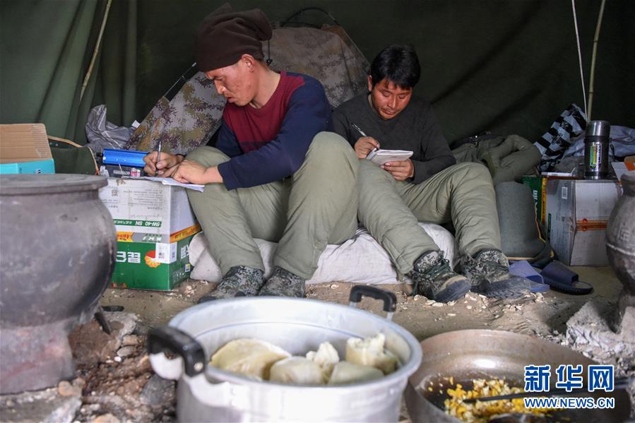1月14日,查線工在吃飯間隙收聽(tīng)電臺(tái)里報(bào)出的不正常道樁號(hào),并記錄在本子上。地球物理勘探是油氣開(kāi)發(fā)的第一步,相當(dāng)于給地球做CT。物探工人按照嚴(yán)格的測(cè)線部署,在相應(yīng)位置鉆井,然后實(shí)施地震,采集地震波數(shù)據(jù)??蒲腥藛T通過(guò)數(shù)據(jù)組成的“CT片”,就能夠清晰地“看”到地下的地質(zhì)結(jié)構(gòu),判斷哪里埋藏有石油或者天然氣。2019年10月,東方地球物理勘探有限責(zé)任公司塔里木物探處2113隊(duì)進(jìn)入新疆塔克拉瑪干沙漠腹地,開(kāi)始中古14-21、塔中2兩個(gè)區(qū)塊的三維地震勘探。近2000名物探工人將在1000平方公里的范圍內(nèi)一直工作到2020年4月,這也意味著他們將在塔克拉瑪干沙漠腹地連續(xù)度過(guò)第14個(gè)除夕夜。蘊(yùn)藏著豐富石油天然氣資源的新疆塔克拉瑪干沙漠有“死亡之海”之稱,氣候干燥,年降水量在50毫米以下,冬季地表最低溫度超過(guò)零下30攝氏度,是世界油氣勘探難度最大的地區(qū)之一。為避開(kāi)風(fēng)季,物探工人每年9、10月份進(jìn)入沙漠,一直工作到來(lái)年4月,夜以繼日與黃沙、嚴(yán)寒為伴,用辛勤的汗水,為祖國(guó)找油找氣。新華社記者丁磊攝