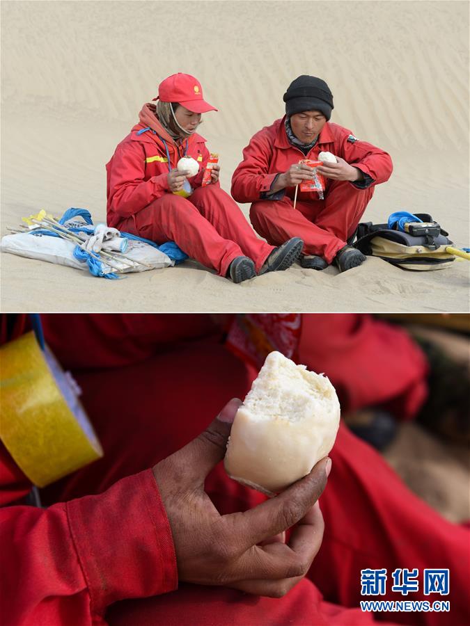 這是一張拼版圖片:上圖為測(cè)量工周?chē)?guó)燕(左)和丈夫杞朝金在沙漠中解決午餐(1月13日攝);下圖為測(cè)量工周?chē)?guó)燕在吃冰涼的饅頭(1月13日攝)。地球物理勘探是油氣開(kāi)發(fā)的第一步,相當(dāng)于給地球做CT。物探工人按照嚴(yán)格的測(cè)線部署,在相應(yīng)位置鉆井,然后實(shí)施地震,采集地震波數(shù)據(jù)??蒲腥藛T通過(guò)數(shù)據(jù)組成的“CT片”,就能夠清晰地“看”到地下的地質(zhì)結(jié)構(gòu),判斷哪里埋藏有石油或者天然氣。2019年10月,東方地球物理勘探有限責(zé)任公司塔里木物探處2113隊(duì)進(jìn)入新疆塔克拉瑪干沙漠腹地,開(kāi)始中古14-21、塔中2兩個(gè)區(qū)塊的三維地震勘探。近2000名物探工人將在1000平方公里的范圍內(nèi)一直工作到2020年4月,這也意味著他們將在塔克拉瑪干沙漠腹地連續(xù)度過(guò)第14個(gè)除夕夜。蘊(yùn)藏著豐富石油天然氣資源的新疆塔克拉瑪干沙漠有“死亡之?!敝Q,氣候干燥,年降水量在50毫米以下,冬季地表最低溫度超過(guò)零下30攝氏度,是世界油氣勘探難度最大的地區(qū)之一。為避開(kāi)風(fēng)季,物探工人每年9、10月份進(jìn)入沙漠,一直工作到來(lái)年4月,夜以繼日與黃沙、嚴(yán)寒為伴,用辛勤的汗水,為祖國(guó)找油找氣。新華社記者丁磊攝