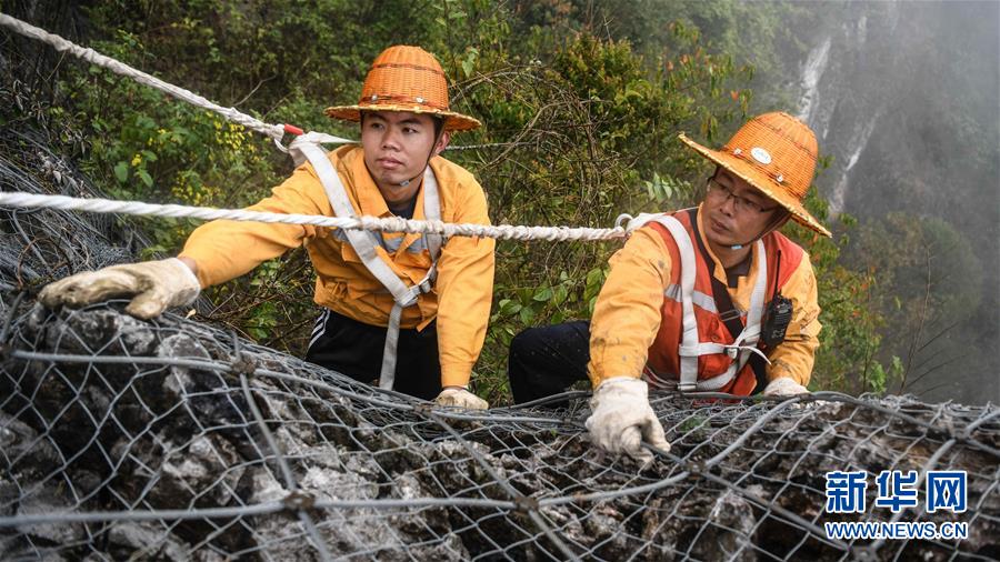 1月14日,百色工務(wù)段白水河橋隧工區(qū)班組工長(zhǎng)王勇(右一)和同事在處理危石。在中國(guó)鐵路南寧局集團(tuán)公司百色工務(wù)段白水河橋隧工區(qū),有一個(gè)由14名工人組成的班組。他們常年像“爬山虎”一樣行走攀爬在地形險(xiǎn)峻、云霧繚繞的高山上,負(fù)責(zé)南昆鐵路轄區(qū)路段的搜山掃石工作,清除一切可能危害鐵路行車安全的因素,保障旅客出行安全。新華社記者張愛(ài)林?jǐn)z