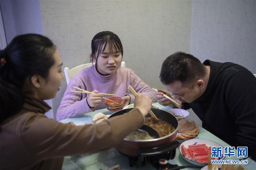 1月14日,趙耀(右)和妻子陳海燕(左)、女兒趙純藝在家里吃火鍋。新華社記者 楊晨光 攝