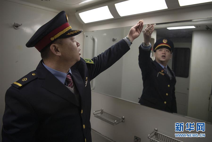 1月11日,在太原開往青島北的K884次列車上,列車長(zhǎng)趙耀在檢查車廂衛(wèi)生情況。新華社記者 楊晨光 攝