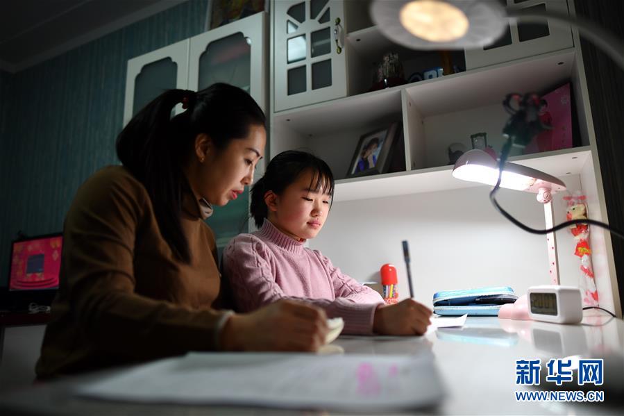 1月14日,陳海燕(左)在家里輔導(dǎo)女兒趙純藝完成作業(yè)。新華社記者 詹彥 攝