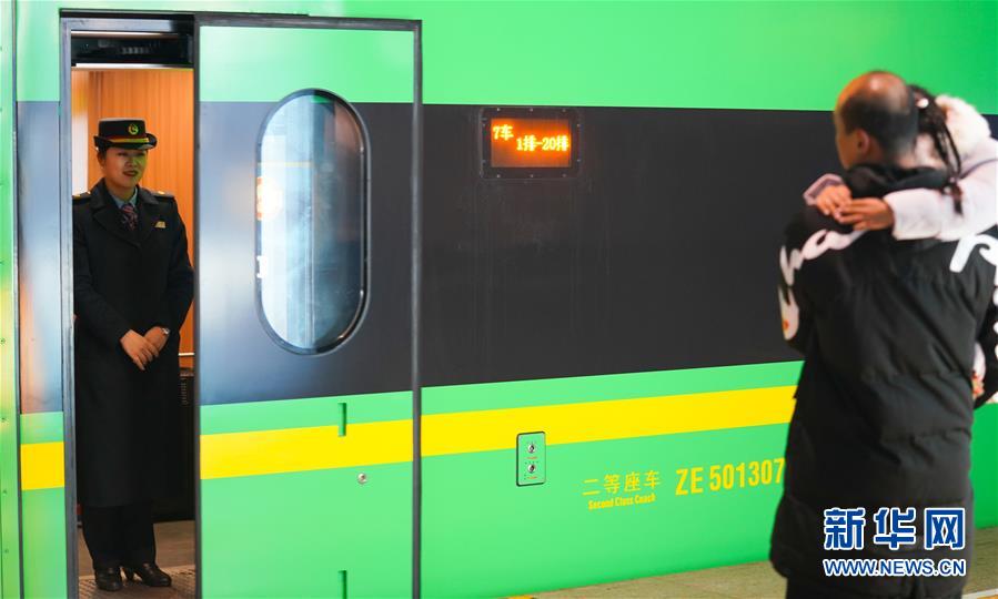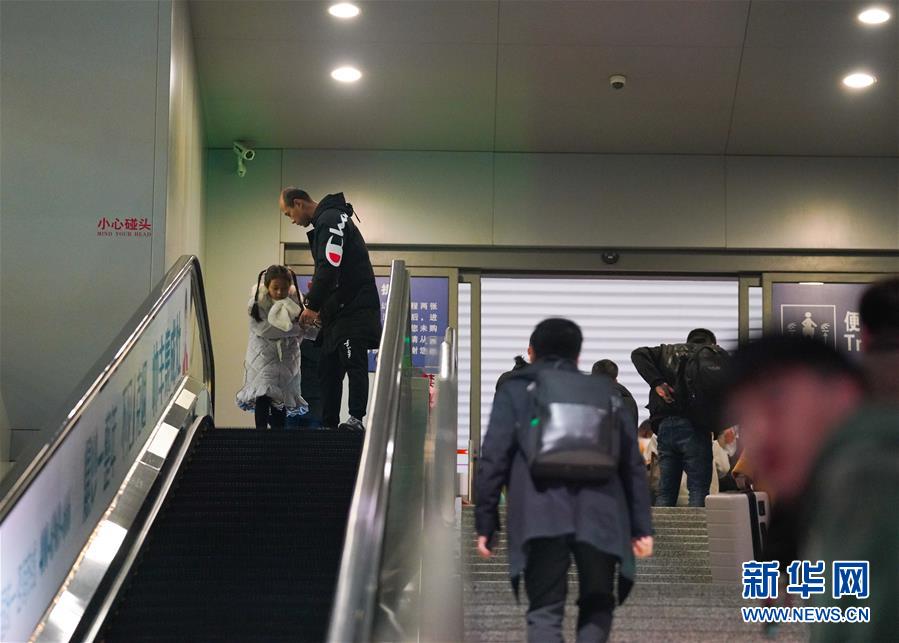 1月3日,卞菁值乘的動(dòng)車到站,朱梓芮(前右)和父親尋找卞菁的身影。新華社記者 胡晨歡 攝