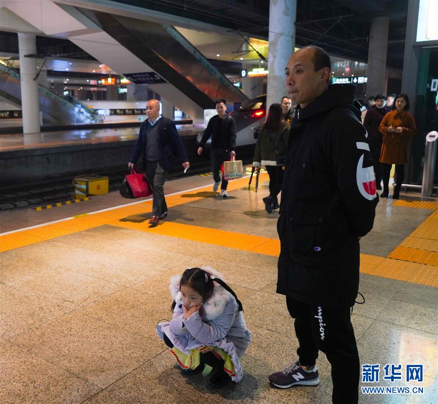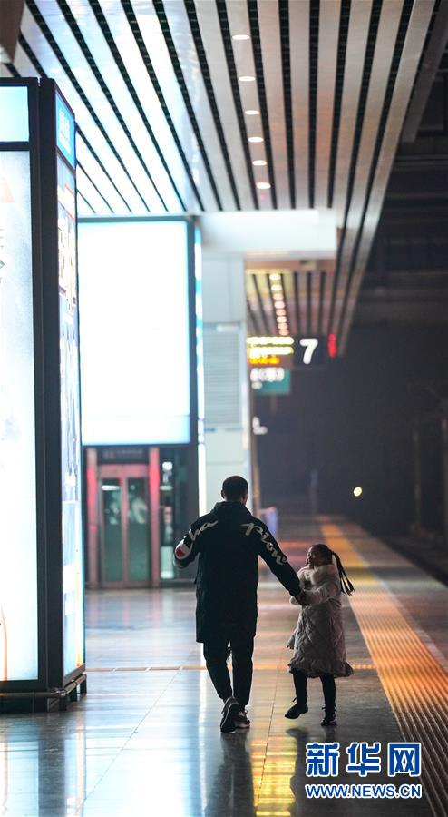 1月3日晚,朱梓芮(左一)在父親朱晨的陪同下前往南昌西站站臺(tái)準(zhǔn)備與母親團(tuán)聚。新華社記者 胡晨歡 攝