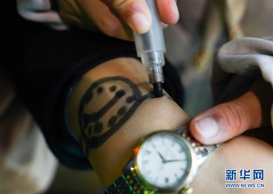 1月3日,朱梓芮在站臺(tái)上將母親手腕上稍有模糊的“手表”描繪清晰。新華社記者 胡晨歡 攝