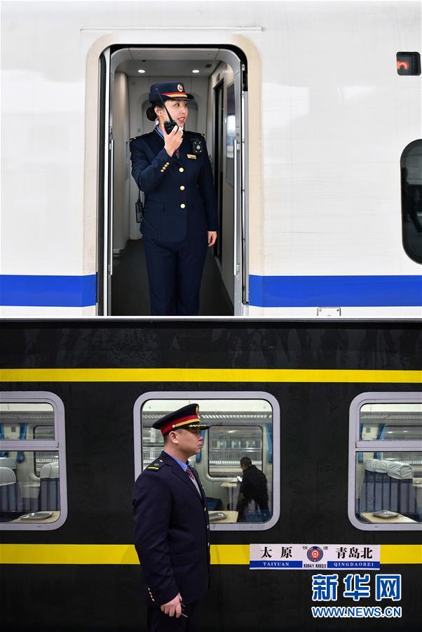 拼版照片上圖:在運城北站,列車長陳海燕確認旅客上車后通過對講機通知司機關閉車門(新華社記者詹彥1月11日攝);下圖:在太原站,列車長趙耀在列車出發(fā)前檢查巡視(新華社記者楊晨光1月11日攝)。新華社發(fā)