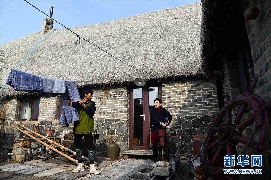 在榮成市煙墩角村,于海洋和母親趙錦蘭在打理海草民宿(1月12日攝)。新華社記者 王凱 攝
