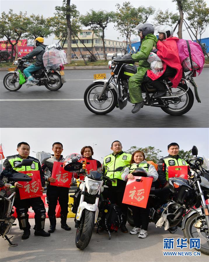 拼版照片:上圖是江西、安徽和湖北籍農民工組成的返鄉(xiāng)“鐵騎大軍”騎行在返鄉(xiāng)路上(2014年1月23日攝);下圖是“90后”外來務工返鄉(xiāng)青年冉曉紅(左三)和騎友們在中石油漳州龍江路加油站合影留念(1月15日攝)。20歲的冉曉紅是重慶人,在福建廈門從事餐飲業(yè),2019年買了一輛高檔摩托車,2020年與朋友結伴騎摩托車返鄉(xiāng),路上預計需要五天時間。 新華社記者 魏培全 攝