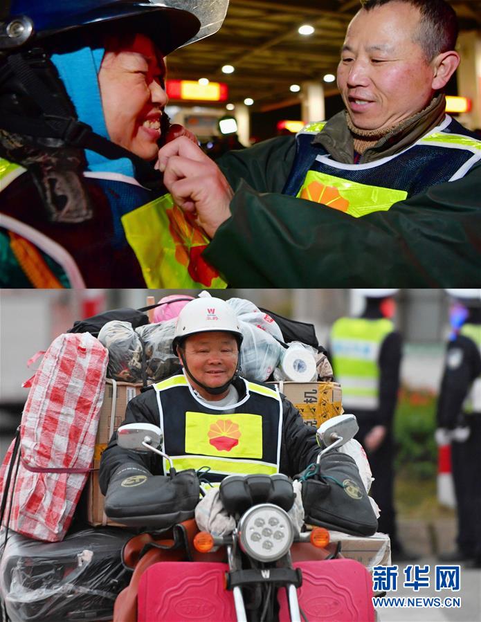 拼版照片:上圖是來(lái)自江西吉安的陳海平(右)在中國(guó)石油泉州博覽大道站給愛(ài)人郭九香整理摩托車(chē)頭盔(1月15日攝)。夫妻倆在福建泉州打工十多年,連續(xù)九年騎著摩托車(chē)返鄉(xiāng),他們表示過(guò)完年后還將再來(lái)泉州工作。