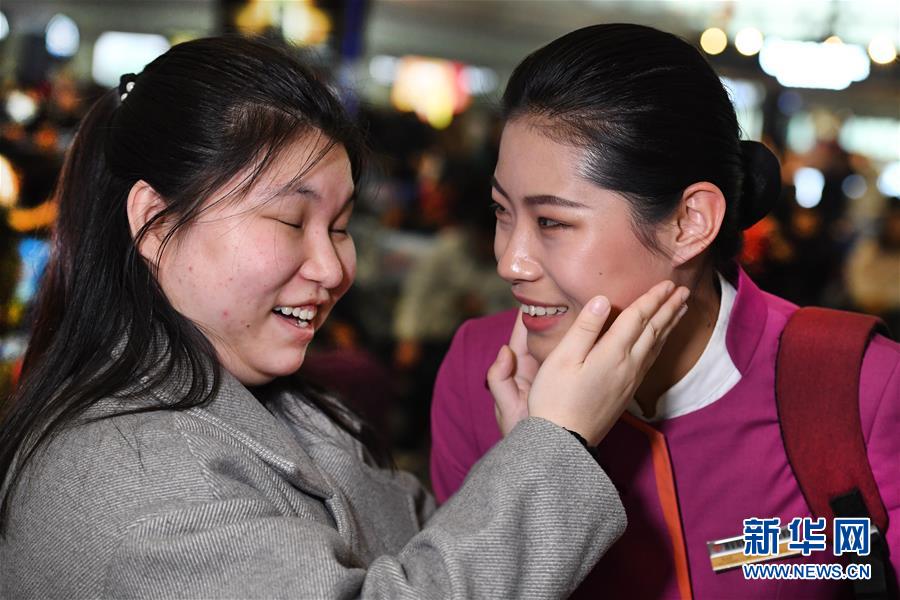 盲人姑娘吳瀟(左)從西安北站中轉(zhuǎn)回延安老家,得到吉如的溫馨服務(wù)。臨別時(shí),吳瀟激動(dòng)地說(shuō):“小姐姐,你的服務(wù)太貼心了,我看不見(jiàn)你,能摸摸你的臉頰嗎?”(1月15日攝)。新華社記者陶明攝