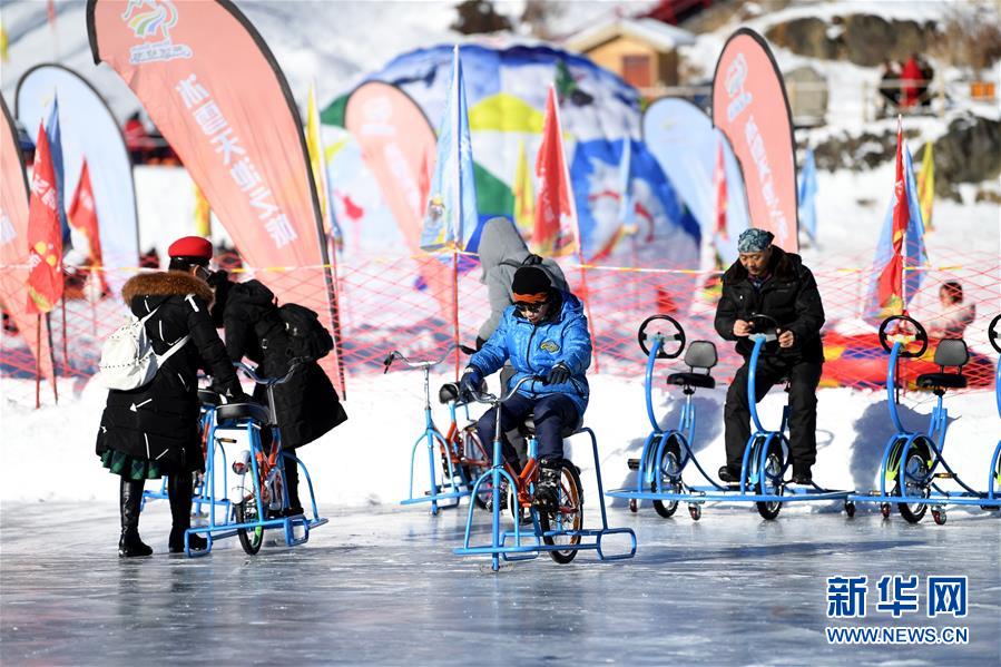 1月18日,游客在新疆天池景區(qū)玩冰上自行車。新華社記者 沙達提 攝