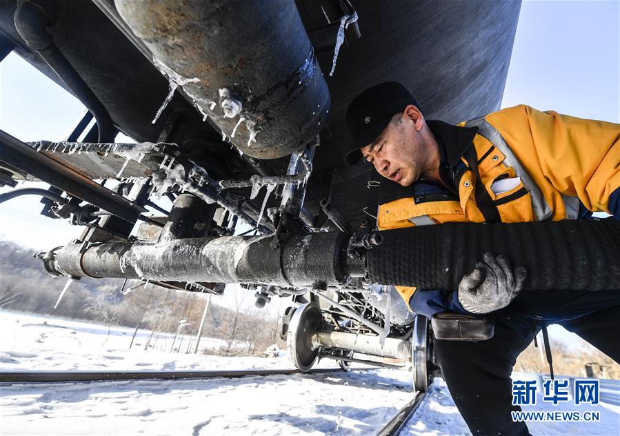 送水員黃衛(wèi)東將輸水管連接到蓄水車的出水口(1月17日攝)。新華社記者許暢攝