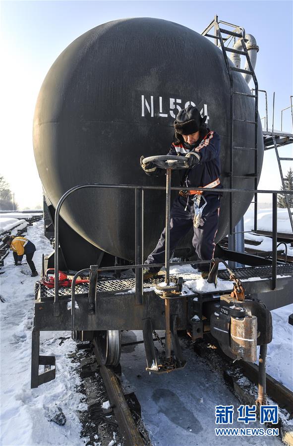 林海間的“送水小火車”調(diào)車員對“送水小火車”進行出行前的檢查作業(yè)(1月17日攝)。新華社記者許暢攝