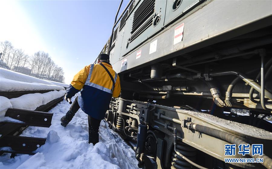 送水員黃衛(wèi)東在雪地中前行,準備登上火車前往送水地點(1月17日攝)。新華社記者許暢攝