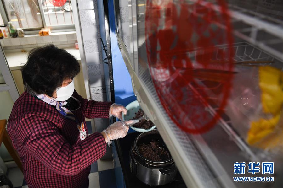 2月28日,張?zhí)m英在合肥市奧林花園社區(qū)的家中做粥,準(zhǔn)備送給疫情防控人員。新華社記者張端攝