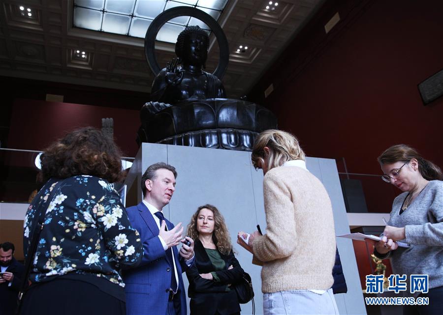 3月2日,在法國巴黎,賽努奇亞洲藝術(shù)博物館館長埃里克·勒菲弗(左二)接受媒體采訪。法國巴黎賽努奇亞洲藝術(shù)博物館經(jīng)過數(shù)月修繕后2日迎客,以更加豐富的展品、全新場景布置和多媒體呈現(xiàn)方式向觀眾展示中國文化和亞洲文化魅力。新華社記者高靜攝