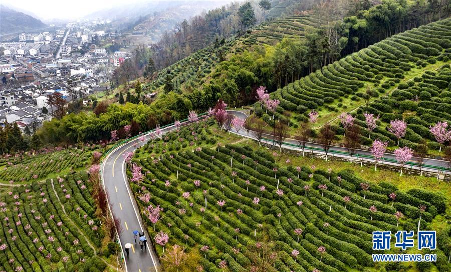 3月2日,游人在春雨中游覽平利縣長安鎮(zhèn)洪福茶山(無人機(jī)照片)。新華社記者陶明攝