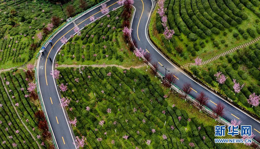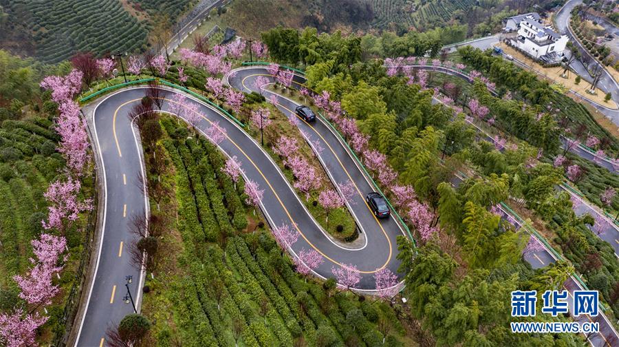 這是3月2日拍攝的平利縣長安鎮(zhèn)洪福茶山,道路兩旁的春梅盛開(無人機照片)。新華社記者陶明攝
