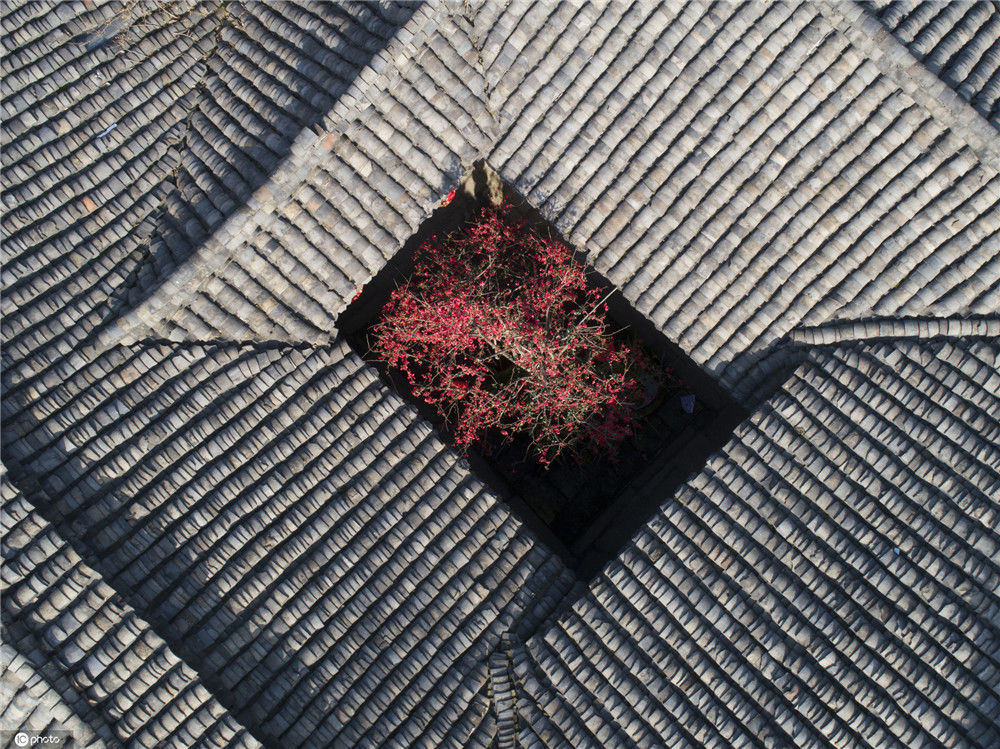2020年2月21日,四川南充閬中古城中天樓旁,張家小院天井中的海棠在陽光中綻放(無人機拍攝)。