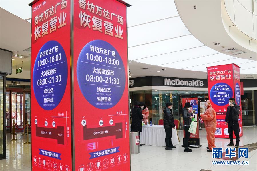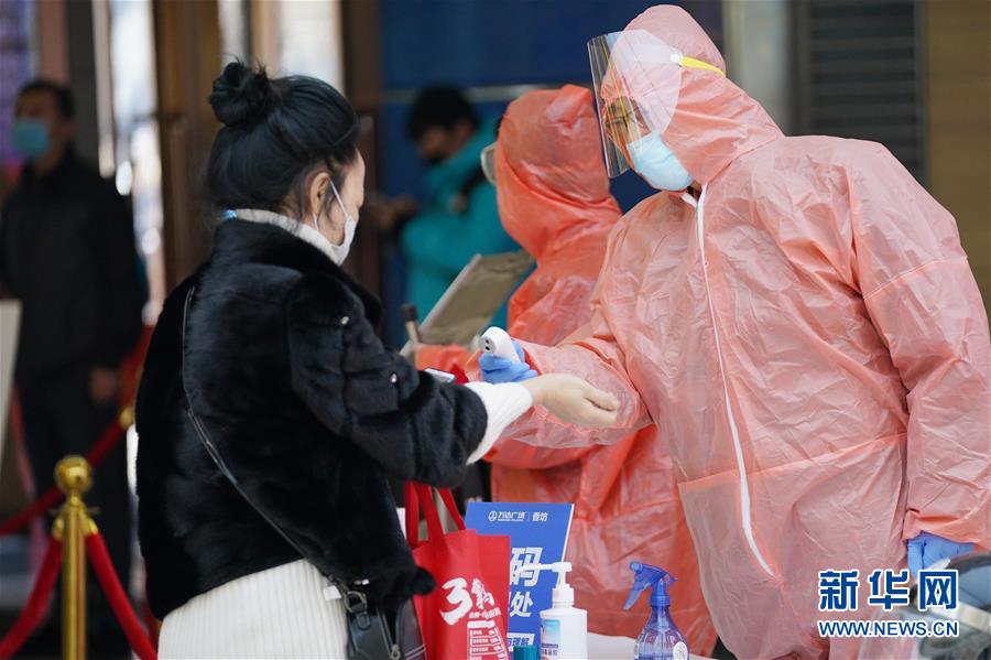 3月13日,在哈爾濱香坊萬達廣場內(nèi),工作人員在給進店顧客測體溫。 近日,哈爾濱市多家大型商場陸續(xù)恢復營業(yè)。這些恢復營業(yè)的商場采取多種措施,從嚴細致做好疫情防控和安全風險防范工作,為廣大顧客提供安全放心的購物空間。 新華社記者 王建威 攝