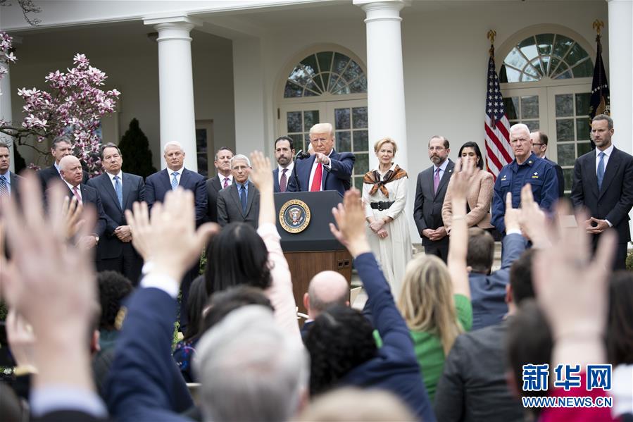 3月13日,在美國華盛頓白宮,美國總統(tǒng)特朗普(中)出席記者會(huì)。特朗普當(dāng)天下午在白宮發(fā)表講話時(shí)正式宣布“國家緊急狀態(tài)”。他說,此舉旨在讓美國聯(lián)邦政府全力投入到抗擊新冠肺炎疫情的努力中。這項(xiàng)舉措將釋放500億美元資金,幫助各州和地方政府應(yīng)對疫情。新華社記者劉杰攝