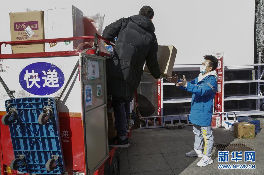 3月12日,李杰(右)在中國青年政治學(xué)院快遞點(diǎn)幫助其他公司同行卸貨。新華社記者張玉薇攝
