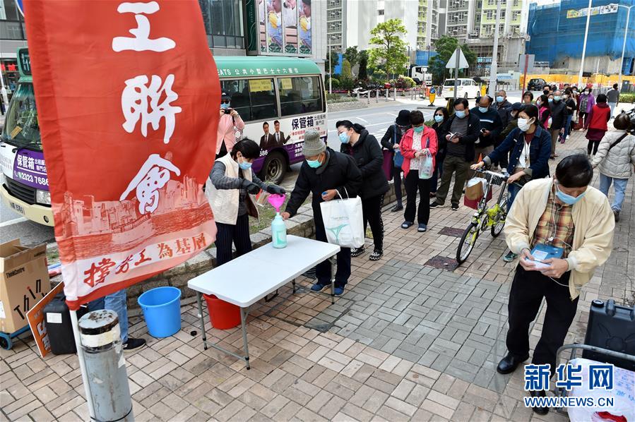 2月23日,市民排隊(duì)領(lǐng)取消毒清潔劑。當(dāng)日,香港工聯(lián)會在將軍澳向市民免費(fèi)派發(fā)消毒清潔劑。新華社記者盧炳輝攝