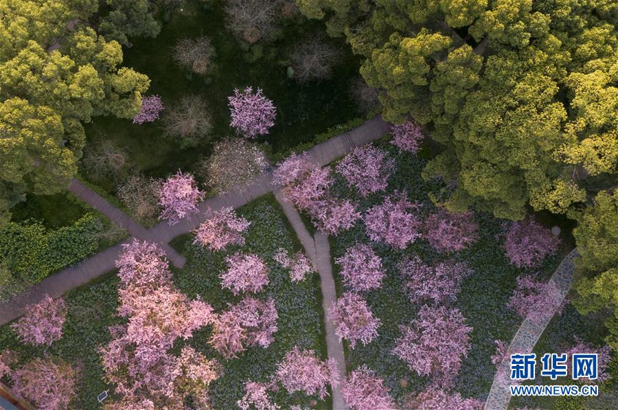 這是3月14日拍攝的武漢東湖磨山櫻園景色(無人機(jī)照片)。近日氣溫漸升,武漢東湖磨山櫻園里的櫻花漸次盛開,帶來春天的氣息。新華社記者熊琦攝