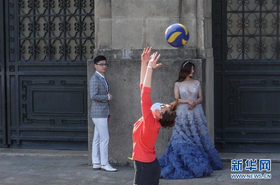 3月15日,在南京東郊體育公園,一對新人在一名練習排球的市民旁拍攝婚紗照。 當日,南京風和日麗,市民們來到東郊體育公園,踏青春游。 新華社記者 楊磊 攝