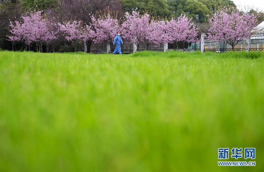 3月3日,一名工作人員從盛開的櫻花樹下走過。新華社記者費茂華攝