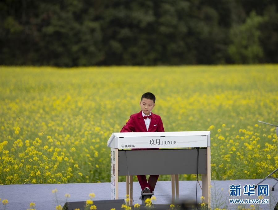 3月16日,一名小演員在李坑村的“花田音樂會”上演奏。 當日,一場別開生面的“花田音樂會”在江西省婺源縣秋口鎮(zhèn)李坑村的油菜花海中舉行,帶給游人新鮮的視聽感受。 新華社記者 張浩波 攝